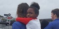 Disaster Aid USA (a Rotary Club Project) Response Team Member carries a young girl across a flooded street to an Evacuation point